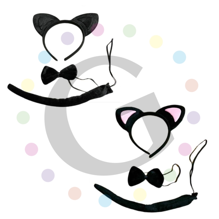 Incluye 1 diadema con orejas, 1 moño y 1 colita. Unitalla. Disponible en Negro y Rosa.