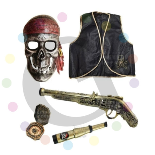 Incluye: 1 mascara de calavera, 1 chaleco, 1 pistola, 1 catalejo y 1 brújula. Talla Niño.
