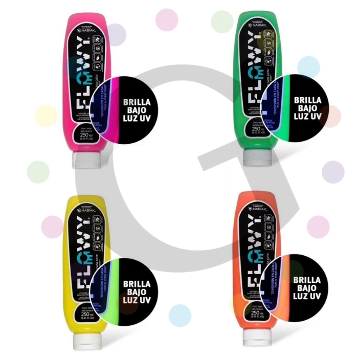 Disponible en Rosa, Verde, Amarillo y Naranja. Brilla en la oscuridad BAJO LUZ UV o LUZ AZUL. Formula especial base agua diseñada para lavarse fácilmente. No tóxica y amigable con